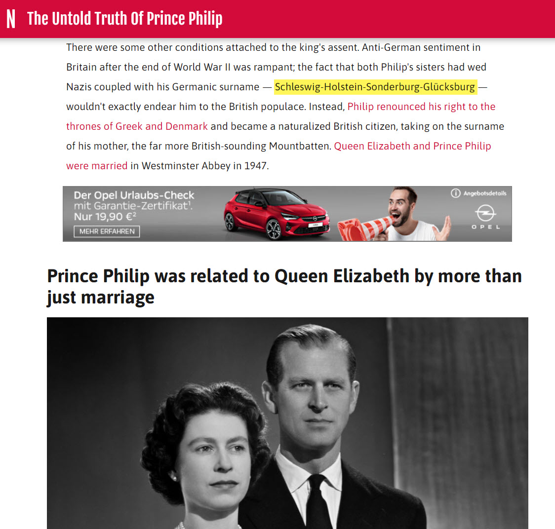 Ich stieß auf Prinzessin Ingeborg zu Schleswig-Holstein, sie ist die Enkelin von Friedrich zu Schleswig-Holstein, der die Stiftung Louisenlund 1949 gründete. Sie übernimmt den Vorstandsvorsitz der Stiftung. Interessant. Dann suchte ich weiter und stieß auf den Namen „Philip, Duke of Edinburgh“. Den kenne ich doch! Tatsächlich! Prinz Philip, der am 9. April verstorbene Prinzgemahl der britischen Königin Elisabeth II! Er ist ebenfalls gebürtiger zu Schleswig-Holstein-Sonderburg-Glücksburg! Ausgerechnet er? Wer hätte das gedacht!? Zieht diese Adelslinie derart große Kreise? Hand aufs Herz: Wusstest du davon? Würde eine derartige Erkenntnis die Briten und Deutschen nicht näher zusammenbringen? Warum berichten die Medien nicht darüber? Warum lernt man in der Schule nichts dazu?