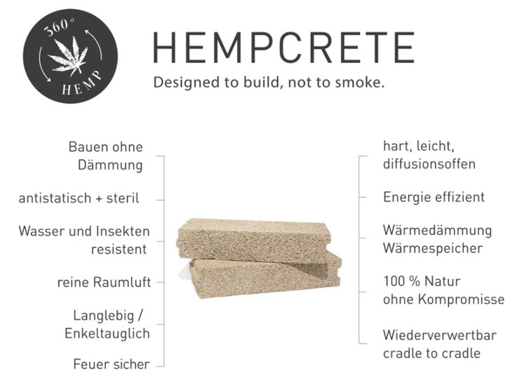 Richtig gelesen: Dieses Material ist feuerfest! Die Hanfpflanze wächst ca. 50-mal schneller als Holz(!), auf einem Hektar Hanffeld wächst in nur 5 Monaten Biomasse für ein kleines Einfamilienhaus.  Der deutsche Produzent Hanfstein listet ein paar Fakten auf: