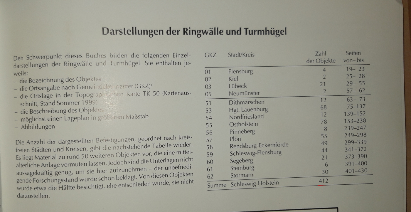 Insgesamt sind alleine in Schleswig-Holstein 543 Burgen oder burgähnliche Anlagen als Kulturdenkmale unter Schutz gestellt, wovon sich noch 393 in der Landschaft ausmachen lassen (ICKERODT, Seite 255)! Laut Arthur Dähn sind es sogar 412 und er hat sich die Mühe gemacht, die genauen Positionen dieser Anlagen in seinem Werk „Ringwälle und Turmhügel“ genaustens aufzuführen (DÄHN, 2001)! Wer hätte das gedacht? Ich auf jeden Fall, bis ich auf dieses Buch gestoßen bin, nicht ansatzweise.