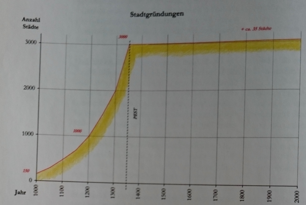 In ca. 300 Jahren wurden in Europa insgesamt 3000 Städte gegründet (ZILLMER, Seite 169). Dieser Städtebauboom fand im Jahre 1342, nach dem Einsetzen der Margaretenflut und dem darauf folgenden Ausbruch der Pest ein abruptes Ende (hier ein Artikel der Zeit zu Deutschlands Jahrtausendflut: https://www.zeit.de/wissen/umwelt/2013-06/hochwasser-magdalenenflut). \“Die Wassermassen entsprachen dem 50- bis 100-Fachen des Hochwassers an der Oder 1997 oder der Elbe 2002 und 2013\“. Ganze Kirchen standen bis zu ihren Türmen unter Wasser.